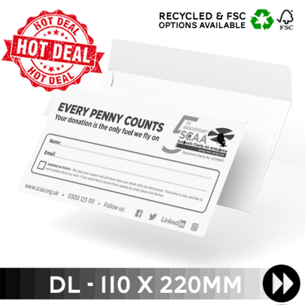 | * Please Choose Your DL Envelope Type | This is a MANDATORY field and must be filled in. This envelope you have chosen to be printed is a standard sized DL 110 x 220mm envelope, also know as postcard sized and as 1/3 the size a sheet of A4 paper. 110mm up the sides and 220mm across the bottom. This envelope is also known as a wallet envelope, which means the flap runs across the top, also known as the long edge. The types of sealing we offer are gummed, self seal and peel and seal. A gummed envelope has to be wetted to stick, a self seal envelope simply sticks when pressed down and the peel and seal option offers a paper strip that you peel away to reveal a sticky strip underneath. The thickness and paper quality is graded using GSM. The thinnest paper being 80gsm which we recommend for big bulk trade mail shots, through to 90gsm the standard bearer for most business's with budgetary requirements, up to the 120gsm envelope which is a high quality premium paper. With more choice of this DL envelope types than anywhere else in the UK today, we have carefully selected the right types of DL envelope here for your printing needs. You get to choose from the following types, in price order: Manilla Gummed With and Without Window 80gsm and 90gsm White Gummed With and Without Window 80gsm and 90gsm Manilla Self Seal Without Window 90gsm White Self Seal With and Without Window 90gsm White Peel and Seal 120gsm The choice is yours to make. |